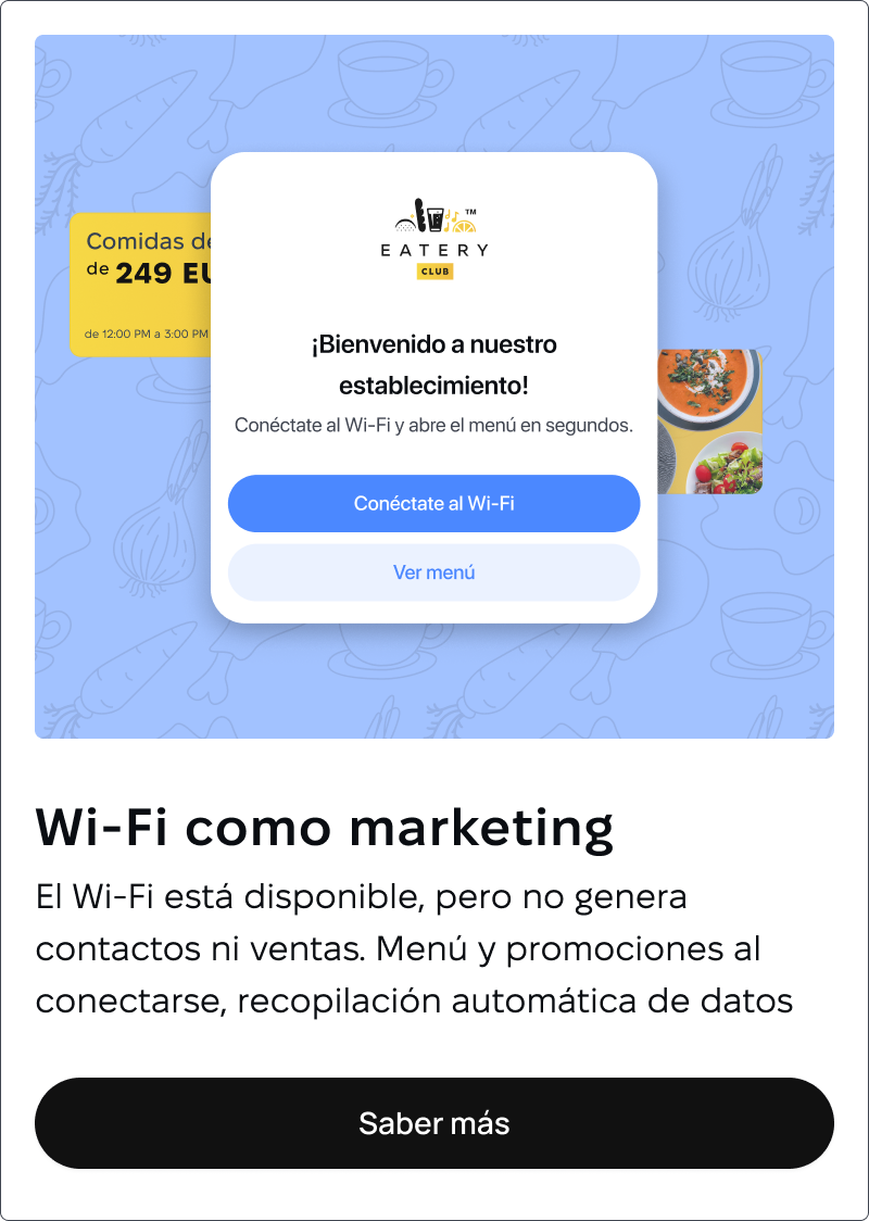 Los portales cautivos son la única forma compatible y efectiva de recopilar datos de clientes en 2026. Y los mejores portales, aquellos que redirigen inmediatamente a tu menú, promociones o programa de lealtad, no solo cumplen con la ley. Generan ingresos, construyen relaciones y convierten visitantes anónimos en clientes conocidos, alcanzables y recurrentes. Combina tu portal cautivo con puntos de contacto complementarios como menús QR en las mesas para una experiencia omnicanal perfecta: los clientes descubren tu marca vía Wi-Fi al llegar, luego ordenan instantáneamente vía QR al sentarse.