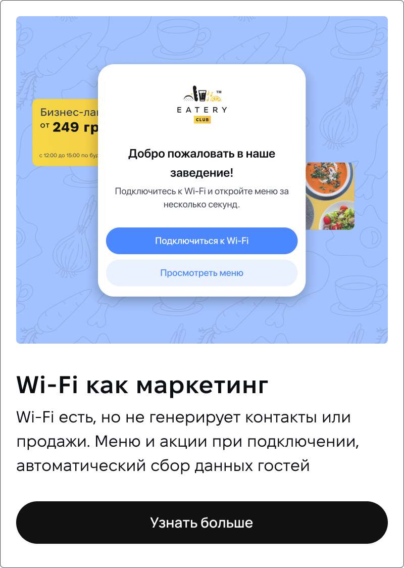 - Лучшие порталы не просто дают интернет, они сразу перенаправляют на меню, уменьшая трение и увеличивая заказы